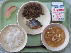 献立:ごはん、鰆の幽庵焼き、味噌汁、五目きんぴら、リンゴ、牛乳