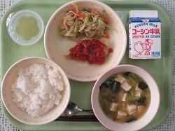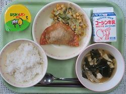 献立:ごはん、揚げギョウザ、わかめスープ、コーンサラダ、はちみつレモンゼリー、牛乳