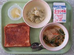 献立:きな粉トースト、ワンタンスープ、粉ふきいも、みかんゼリー、牛乳