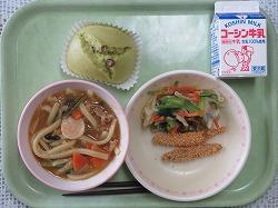 献立:カレーうどん、きびなごのカリカリフライ、梅ドレッシングサラダ、抹茶蒸しパン、牛乳