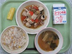 献立:コーン茶めし、肉豆腐、味噌汁、パインアップル、牛乳