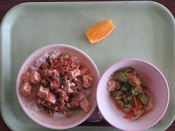 献立:麻婆豆腐丼、カムカムサラダ、オレンジ、牛乳