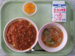 献立:ターメリックライス、キーマカレー、コンソメスープ、桃ゼリー、牛乳