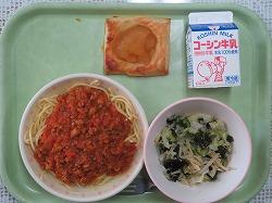 献立:スパゲッティミートソース、わかめサラダ、アップルパイ、牛乳