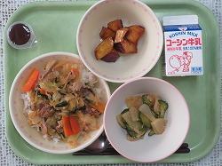 献立:豚肉のプルコギ丼、大根のゴマ酢和え、大学芋、牛乳
