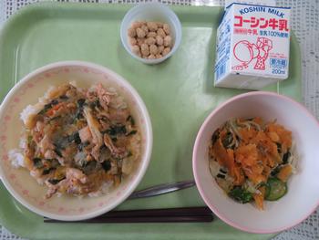 献立:ぶたキムチ丼・じゃこのカリカリサラダ・きなこまめ・牛乳