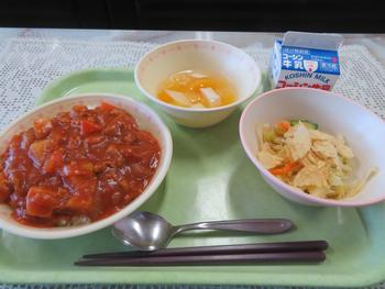 献立:ハヤシライス・ポテトチップスサラダ・フルーツあんにん・牛乳