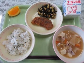 献立:わかめごはん・しろみざかなのフライごまソースがけ・とんじる・ひたしあおまめ・オレンジ・牛乳