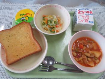 本日の献立のメインは人気のリクエストメニューの「おいしい給食」です。「ポークビーンズ」はだいず、グリーンピースなどのお豆をケチャップやチリパウダーで濃厚な味付けにしてあります。あったかくて、ウィンナーの風味もきいて子どもたちもよく食べるそうです。また「ガーリックトースト」は厚切りの手作りトーストで食べ応えがあります。コーンサラダのさわやかなお酢の風味やデーザートに人気の「はちみつレモンゼリー」をつけることで、食後の口の中がさわやかな甘味でさっぱりとします。今日の給食も栄養教諭の先生と調理員さんに感謝です。ごちそうさまでした。