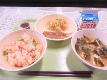 献立:たけのこごはん・あじのごまみそやき・みそしる・はるさめサラダ・ひとくちゼリー・牛乳