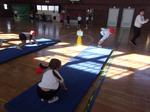 今日の3時間目に体育館で1年生が体育の授業を行ないました。マット運動の前転をしました。本運動の前にドリル学習でいろいろな動きをしました。手首回し、縄回し、なわとび、台上前転、前転、うさぎ跳び、かえるの足うち、ゆりかご等です。「きれいな前転ができるようにアドバイスしよう。」というめあてで、友だちの前転をタブレットを使って撮影し、班の中でアドバイスをし合いました。上手に撮影をして、友だちと見合って学習を深めようとしていました。進んで活き活きと運動していました。