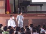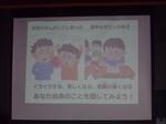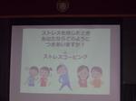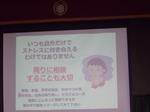 今日のテーマは「ストレスコーピング」です。最初に子どもたちにストレスを感じるときはどんな時?か聞きました。「兄弟げんか」「宿題」「ゲーム」等がでました。次にどうやって解消していますかと聞かれました。「食べる」「寝る」「話す」「歌う」等がでていました。先生方にも同じ質問が当たり、皆真剣に答えていました。「チョコレートを食べる」「サウナ」「音楽を聴く」等が解消法で「わかる、わかる」と子どもたちも納得していました。