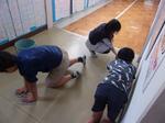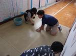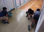 清掃の時間に校長室前の廊下から、「シュッツ、シュッツ、シュッツ」と音がするので、何だろうと思って見てみると3年生がたわしで床を磨いていました。いつも黒くなっていたビニールの廊下もきれいになりました。3年生の皆さんありがとうございました。