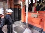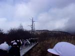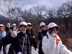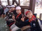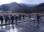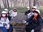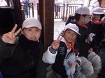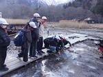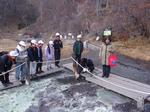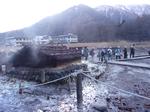 温泉神社に立ち寄り、とっても急な階段を上ってお参りしました。みんな何をお願いしたのでしょう。その後、源泉に向かい、地面から噴き出している硫黄の匂いのする温泉の元に手を入れたりしながら、源泉の熱さを体験しました。それから木道を通って温泉寺に行くと鹿が何頭かいるのを見ました。みんな「鹿がいる。しーっ」と静かに観察していました。最後に足湯に寄り、温まりました。みんな喜んでいて、歩き疲れた足が回復したようです。この頃一番雪が降ってきました。