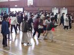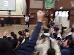 最後にお待ちかねのチャレンジマッチがありました。各クラスの代表児童が、デモ選手と試合を行います。2人目までは惜しくも2対3で負けていましたが、子どもたちの応援がすごく盛り上がっていました。3人目は全国大会で優勝したこともある児童で、足さばきや攻守の切り替えの速さも素晴らしく、互角に打ち合い、応援も熱気を帯び、2対2から最後に粘って3対2で勝った時は、体育館が割れんかの大拍手で大盛り上がりでした。