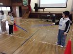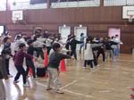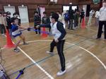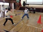 フェンシング体験会では、全員が立ち方、礼の仕方、足さばき(前後)、突き方を教えてもらい、その後で、「スマートフェンシング」という特別にケガをしない道具で、子ども同士が1対1でフェンシングの試合を体験しました。3点先取でフェンシングを楽しみました。