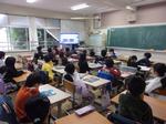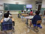 全校朝会の放送画面を見ている1年生の教室となかよし学級の教室の様子です。