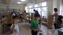20分休みに各教室と図書室をまわりました。1年生の教室には高学年の子が、1年生の遊びのお手伝いをしていました。仲良く遊んでいる様子です。折り紙を折って、ハサミで工夫して切って、線対象な模様をつくっている子もいます。1年生の子から「校長先生、これあげる」と、きれいな模様をもらいました。