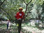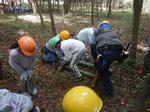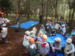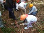 道の駅しょうなんでトイレ休憩をとった後、農業体験、水辺体験、環境体験、森林体験のグループごとに分かれました。森林体験グループは、五本松運動公園の裏手の森で、まず、伐倒デモンストレーションを見た後、森についてお話を聞いたり、ネイチャービンゴをしたり、丸太コースター作りをしたりしました。大きな木が、切り倒されるデモンストレーションは大迫力でした。ネイチャービンゴのマスの中にのこぎりを使った間伐体験もありました。なぜ、森林は整備をしなければならないのか、よく話を聞いて、体験してみて、大切さが子どもたちにもよくわかったようです。珍しい玉虫もいたようです。