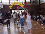 6年生と手をつないで1年生が入場してきました。花のアーチの下をくぐってとてもうれしそうです。胸には6年生が作ったペンダントをかけています。