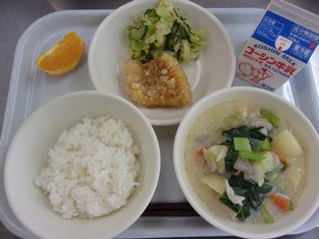 【献立】 ごはん いかのかりんとうがらめ こんぶあえ とうにゅういりやさいじる オレンジ ぎゅうにゅう 「とうにゅういりやさいじる」 今日の豆乳入り野菜汁には、さつまいも、ごぼう、だいこん、こんにゃく、にんじん、こまつな、ねぎ、豚肉、油揚げ、豆乳を使いました。油揚げや豆乳などの豆製品を豊富に使っているので、たんぱく質をたくさんとることができます。のこさずに食べましょう。 |