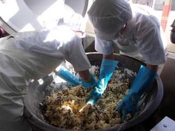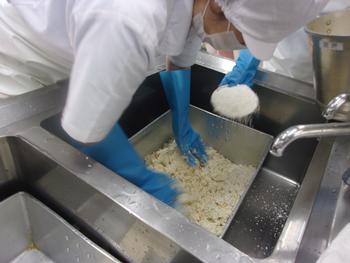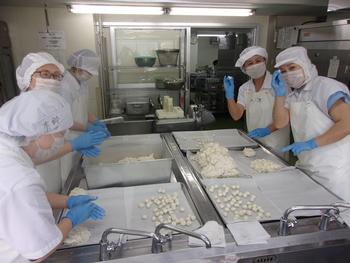 『とうふのだんごじる』 きょうのとうふのだんごじるはょうりいんさんたちのてづくりだんごです。 しらたまこにとうふとすりごまをいれて、よくまぜ合わせた後にひとつひとつていねいに丸めて煮こんで作ります。 ふだんのしらたまもちとはまたちがい、やわらかくてあいじょうもえいようもたっぷりのとうふのだんごじるです。 あじわってたべてくださいね。 |