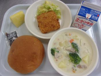 【献立】 セルフフィッシュバーガー きゃべつソテー クラムチャウダー パインアップル ぎゅうにゅう 「クラムチャウダー」 クラムチャウダーは、アメリカの料理です。貝という意味の「クラム」と具だくさんのスープという意味の「チャウダー」を合わせてこのように呼ばれるようになりました。あさり、ベーコン、とり肉、じゃがいも、たまねぎ、にんじんが入っています。残さずに食べましょう。 |