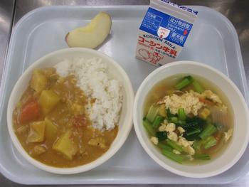 【献立】 ポークカレーライス こまつなとたまごのスープ りんご ぎゅうにゅう 「ポークカレーライス」 今日のポークカレーには、ぶたにく、あさり、じゃがいも、たまねぎ、にんじん、トマト、チーズが入っています。寒小のカレーは、ルウから手作りしています。よく味わって食べてください。 |