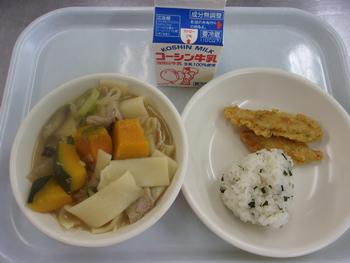 【献立】 ほうとう わかめおにぎり わかさぎのフリッター ぎゅうにゅう