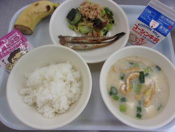 【献立】 ごはん おかかふりかけ ししゃものこうみやき かむかむサラダ まめっこじる バナナ ぎゅうにゅう