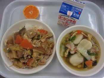 「すきやきどん」 今日のすき焼き丼には、ぶた肉、とうふ、しらたき、白菜、ふ、にんじん、ねぎ、えのき、しめじ、しいたけが入っています。しいたけには、ビタミンDがたくさん含まれています。ビタミンDは、骨を丈夫にするはたらきがあります。残さずに食べましょう。
