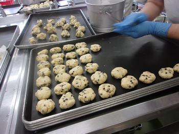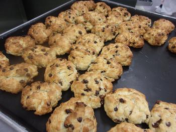 【チョコスコーン】 今日のチョコスコーンは調理室手作りのスコーンです☆彡 大きな『かま』で材料を混ぜ合わせて、一つ一つていねいに丸めて焼きます。 今日はチョコチップも入っているスコーンです。 よくかんで食べてくださいね♪