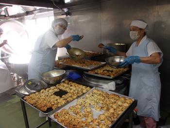 【献立】 みそラーメン さむかぜDAIがくいも きんぴらこんにゃく チーズドック ぎゅうにゅう 「きんぴらこんにやく」 今日のきんぴらには、ぶた肉、さつまあげ、だいず、にんじん、ごぼう、さやいんげん、こんにゃくを入れました。ごぼうには、食物繊維がふくまれています。食物繊維は、おなかの中を掃除するはたらきがあります。よくかんで食べましょう。 |
