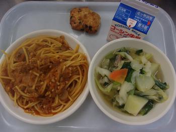 【献立】 スパゲティボロネーゼ チョコスコーン ベジタブルスープ ぎゅうにゅう