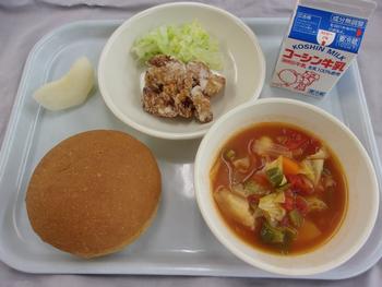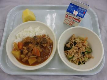 【献立】 チキンカレーライス・サイダー入りフルーツパンチ・牛乳 「チキンカレーライス」 今日の給食は、チキンカレーライスです。玉ねぎを炒め、カレー粉などのスパイスと一緒にとり肉をじっくりと煮込んで作りました。とり肉には、からだをつくる栄養素がたくさん含まれています。残さずに食べましょう。 |