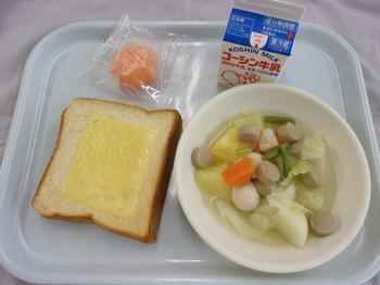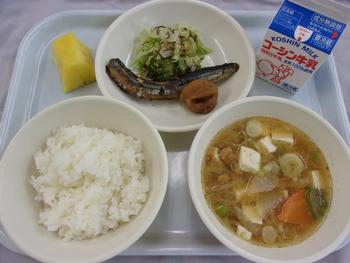 ごはん のりふりかけ やきししゃも 「とうにゅういりやさいじる」 今日の豆乳入り野菜汁には、さつまいも、ごぼう、だいこん、こんにゃく、にんじん、こまつな、ねぎ、豚肉、油揚げ、豆乳を使いました。油揚げや豆乳などの豆製品を豊富に使っているので、たんぱく質をたくさんとることができます。のこさずに食べましょう。 |
