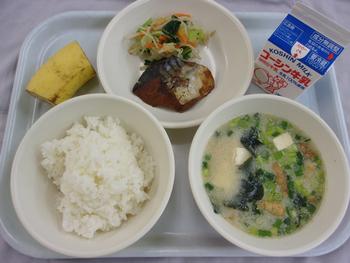 「サバの味噌煮」 きょうのみそ煮に使っている魚は、秋が旬のさばです。さばには血液をサラサラにする油だけではなく、血や筋肉など体を作っているたんぱく質もたくさんあります。魚には骨もあります。骨に気を付け、よく噛んで食べましょう。 |