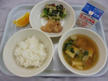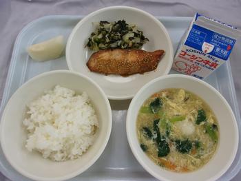 「やさいのごまあえ」 今日のやさいのごま和えには、ほうれんそう、もやし、きゃべつ、ごまを使っています。きゃべつには、食物繊維がたくさん含まれています。食物繊維には、おなかの調子を整えるはたらきがあります。よくかんで食べましょう。 |