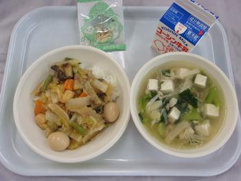 「ちゅうかどん」 今日の中華丼には、ぶたにく、いか、えび、にんじん、たけのこ、きくらげ、しいたけ、白菜、さやいんげんを入れました。にんじんには、目のはたらきを助ける、ビタミンAがたくさん含まれています。のこさずに食べましょう。 |