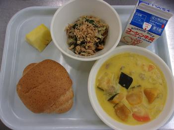 はいがパン かぼちゃのシチュー のりサラダ パインアップル ぎゅうにゅう