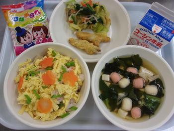 「ひなまつり」 今日はひな祭りです。ひな祭りとは、「桃の節句」の行事です。今日はみなさんのすこやかな成長と健康を願い、さくらちらしずしを出しました。今日のちらしずしには、れんこんや、きんし卵など、縁起がよい食材を使っています。よく味わって食べましょう。 |