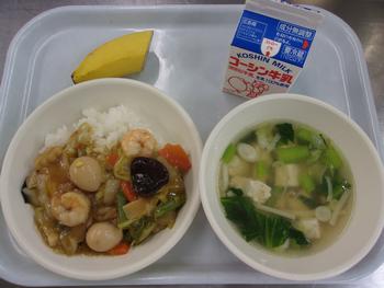 【献立】 ちゅうかどん はるさめスープ バナナ 「ちゅうかどん」 今日の中華丼には、ぶたにく、いか、えび、にんじん、たけのこ、きくらげ、しいたけ、白菜、さやいんげんを入れました。にんじんには、目のはたらきを助ける、ビタミンAがたくさん含まれています。のこさずに食べましょう。 |