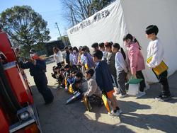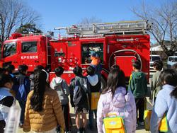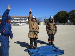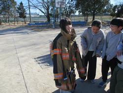 29日(木)3年生の消防署出前授業です。伊藤先生も消防服を着てみました。