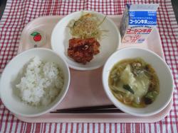 ごはん こどももたべられるヤンニョムチキン おかかあえ ワンタンスープ ひとくちリンゴゼリー ぎゅうにゅう |