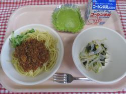 ジャージャーめんふうスパゲッティ マンナンサラダ エメラルドむしパン ぎゅうにゅう |