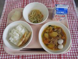 チキンとおまめのカレーライス チップスサラダ れいとうみかん ぎゅうにゅう
