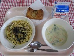 わふうボンゴレスパゲッティ コーンクリームスープ くりとはなまめのパイ ぎゅうにゅう