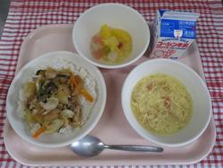 プルコギどん トマトとたまごのスープ フルーツポンチ ぎゅうにゅう |