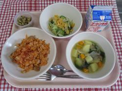 ごはん とうふのちゅうかに じゃこのカリカリサラダ ぎゅうにゅう |