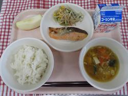 ごはん さけのさいきょうやき コーンとあおなのごまあえ かぼちゃたっぷりとんじる りんご ぎゅうにゅう |